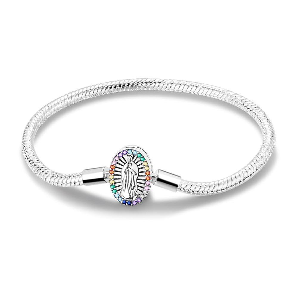 Sterling silver 925 bracelet featuring an oval charm with the image of Our Lady, surrounded by a rainbow of sparkling crystals. A symbol of faith, protection, and devotion.