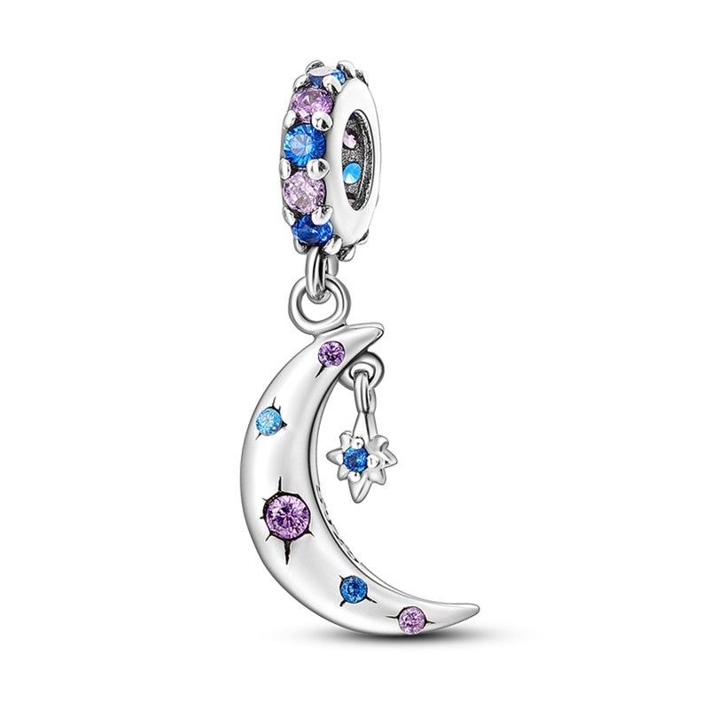 Crafted in 925 sterling silver, this charm features a crescent moon adorned with sparkling purple and blue stones, with a delicate star gently hanging in the center.