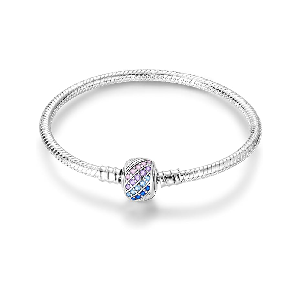 Sterling silver 925 bracelet with a round clasp decorated with sparkling pastel crystals in shades of pink, purple, and blue. A delicate and colorful piece to brighten any look.